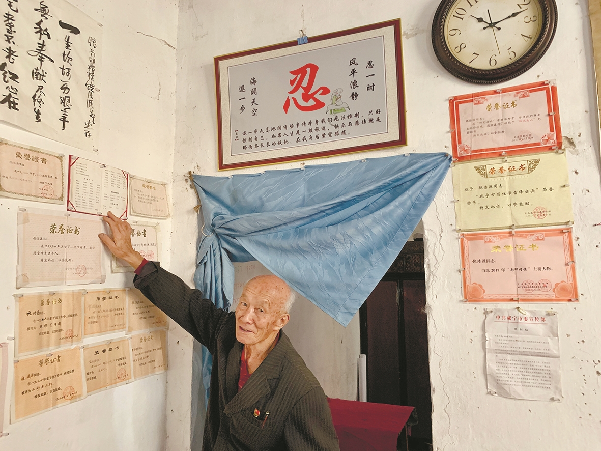 目前忙着宣传楷模的饶浩源,本身也是一位楷模。关心下一代先进个人、五好老干部、“两个文明”建设先进工作者、阳光老人、学雷锋标兵……饶浩源家中客厅的墙壁上,贴满了荣誉证书。2017年,他又当选为“南鄂楷模”。