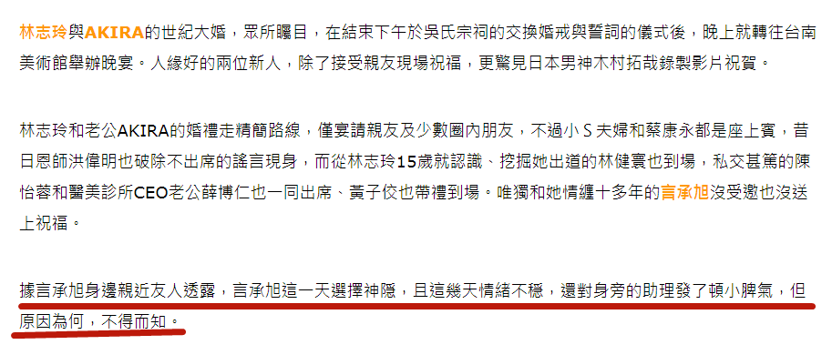 网易娱乐11月18日报道 据台媒报道,林志玲出嫁当日,言承旭的举止反常。报道中称,言承旭的友人透露,言承旭在林志玲大婚当天选择了神隐,一天都没有消息,而且最近几天情绪一直都不稳定,还对身边的助理发脾气,举止反常。