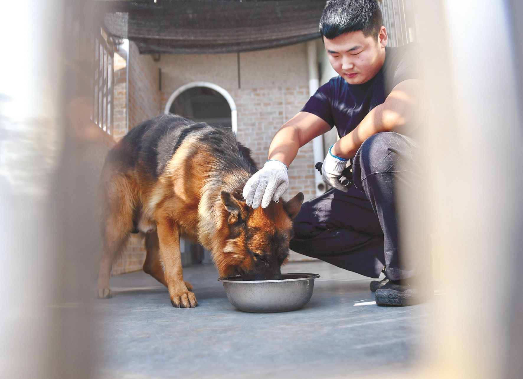 住得好,吃得也不错。每只警犬每天要吃两顿,上午一餐吃狗粮,下午一餐吃鸡肉、牛肉等熬制的流食。食谱由专业营养师制定。