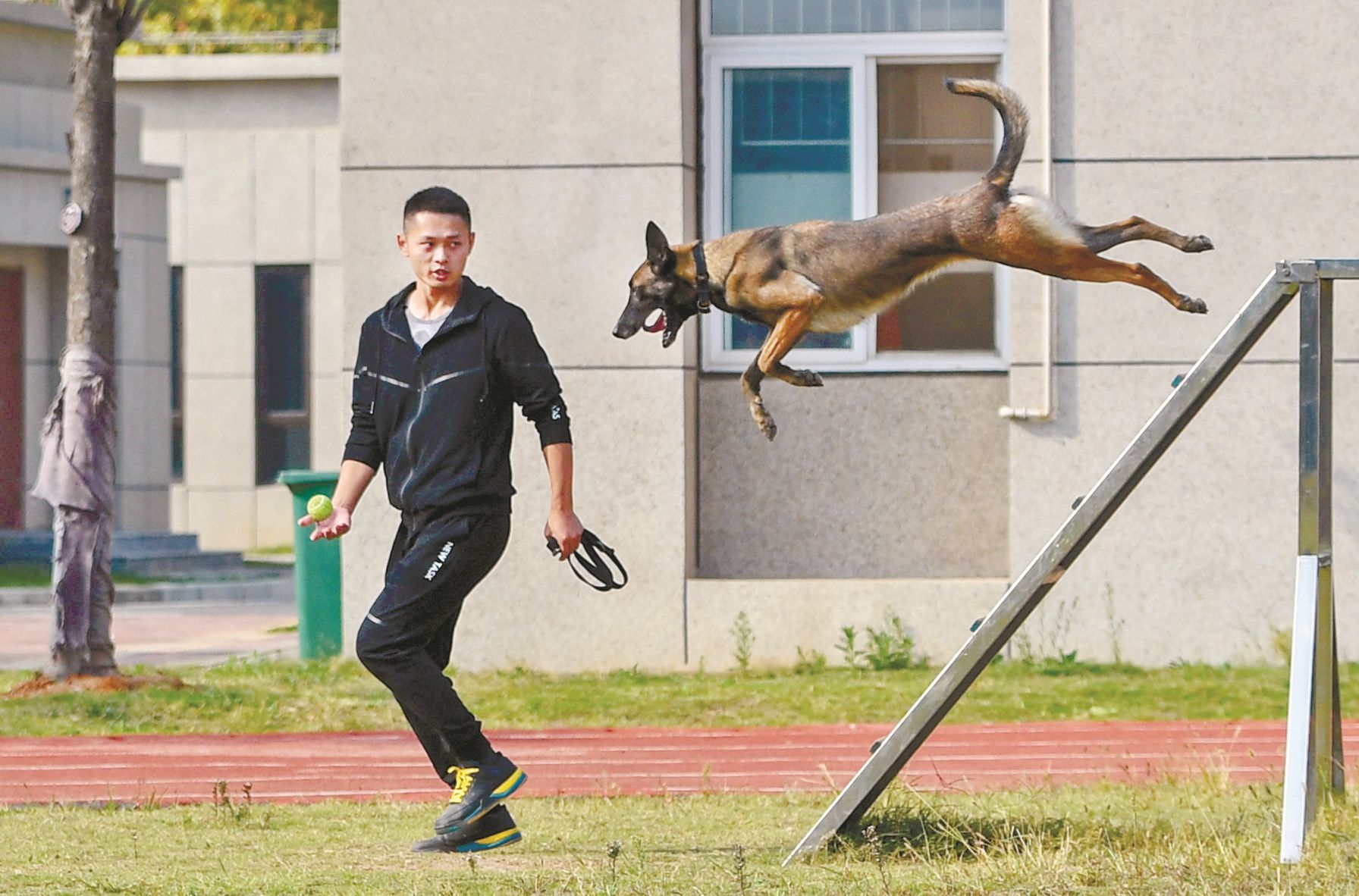 武汉市公安局警犬基地内,训导员带领警犬进行越障碍跑。 楚天都市报记者刘中灿摄