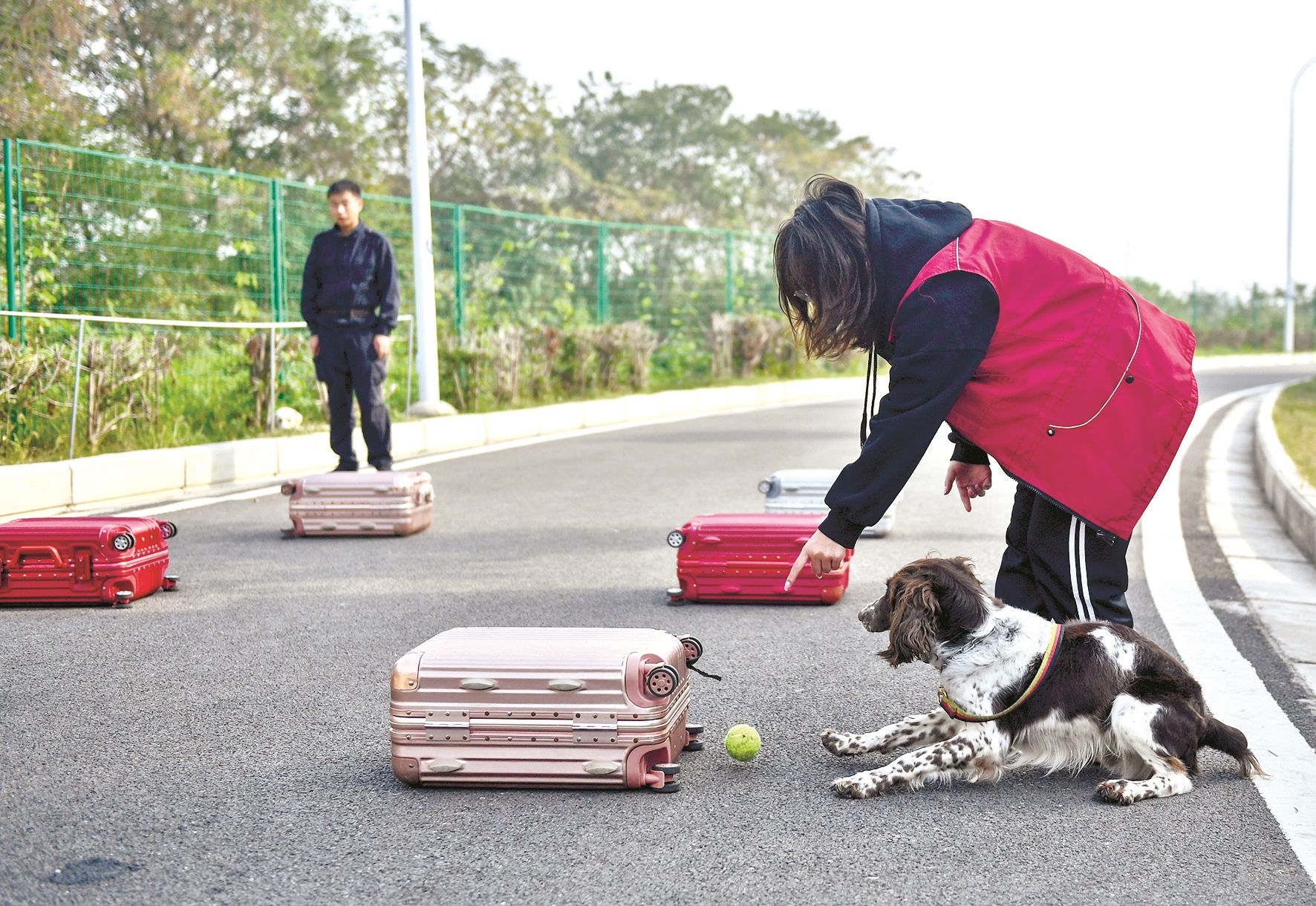 关系熟了,廖一鸣开始循序渐进地训练“小黑”,从最基本的坐、立、卧口令练起,逐步提升默契度。对于警犬而言,类似的服从科目训练只能算是初级课程。等到基础打好,训导师会根据它们各自的特点,把它们细分到搜爆、追踪、缉毒等不同专业,并进行针对性训练。