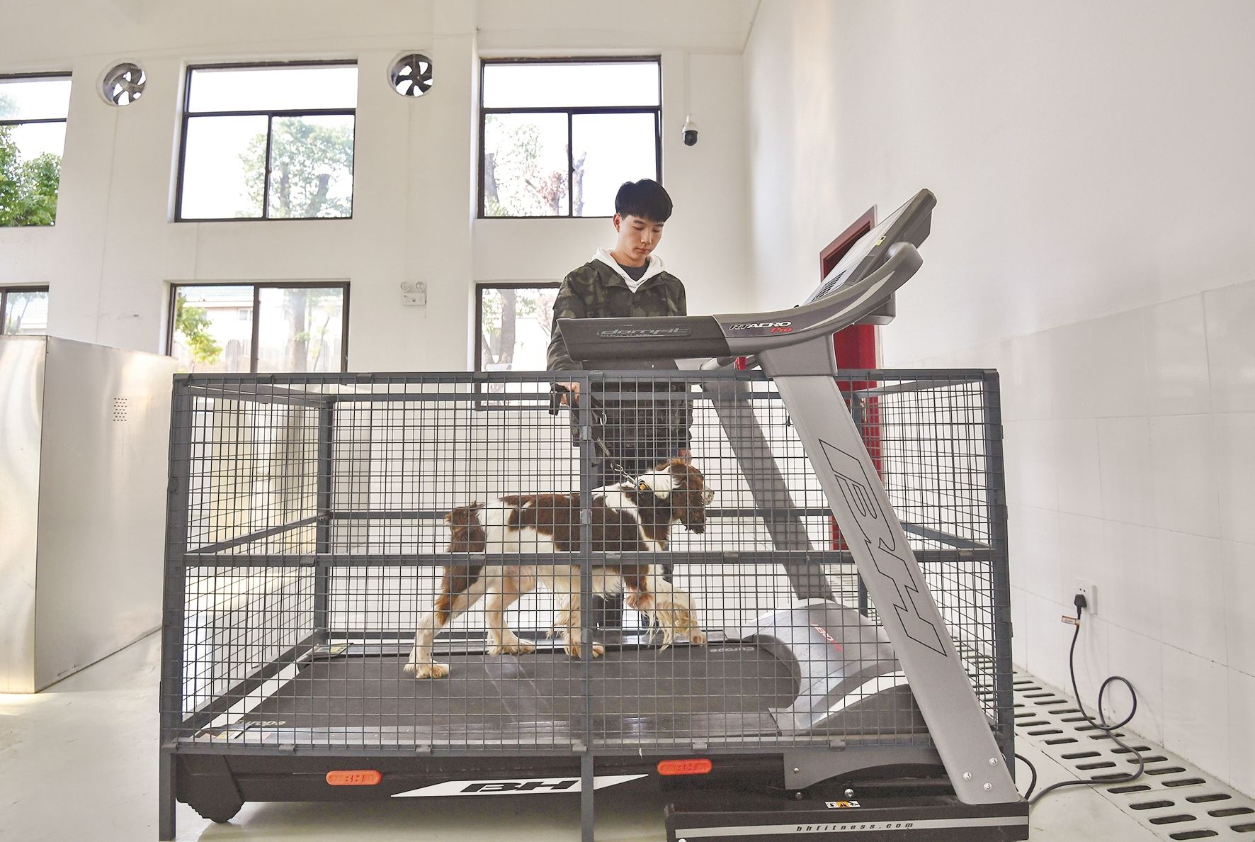 为了完成高强度工作,体能训练是每只警犬的必修课。除了越野、越障等室外训练项目,警犬们还会在跑步机上训练。记者看到,一字排开的特制跑步机上,几只警犬吐着长长的舌头,卖力地奔跑着。“警犬们跑起来,至少10公里起步。”杨文峰说。