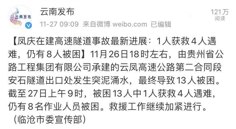 27日2时28分许,被困13人中已有1人被救出送往凤庆县人民医院救治,生命体征平稳。