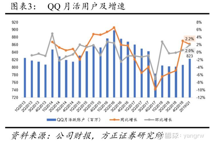 与之对应的 QQ ,用户日活在 2016 年到 2017 年之间稳步下跌,即便到 2019 年经过部分增长,月活数也仅为 8.2 亿。