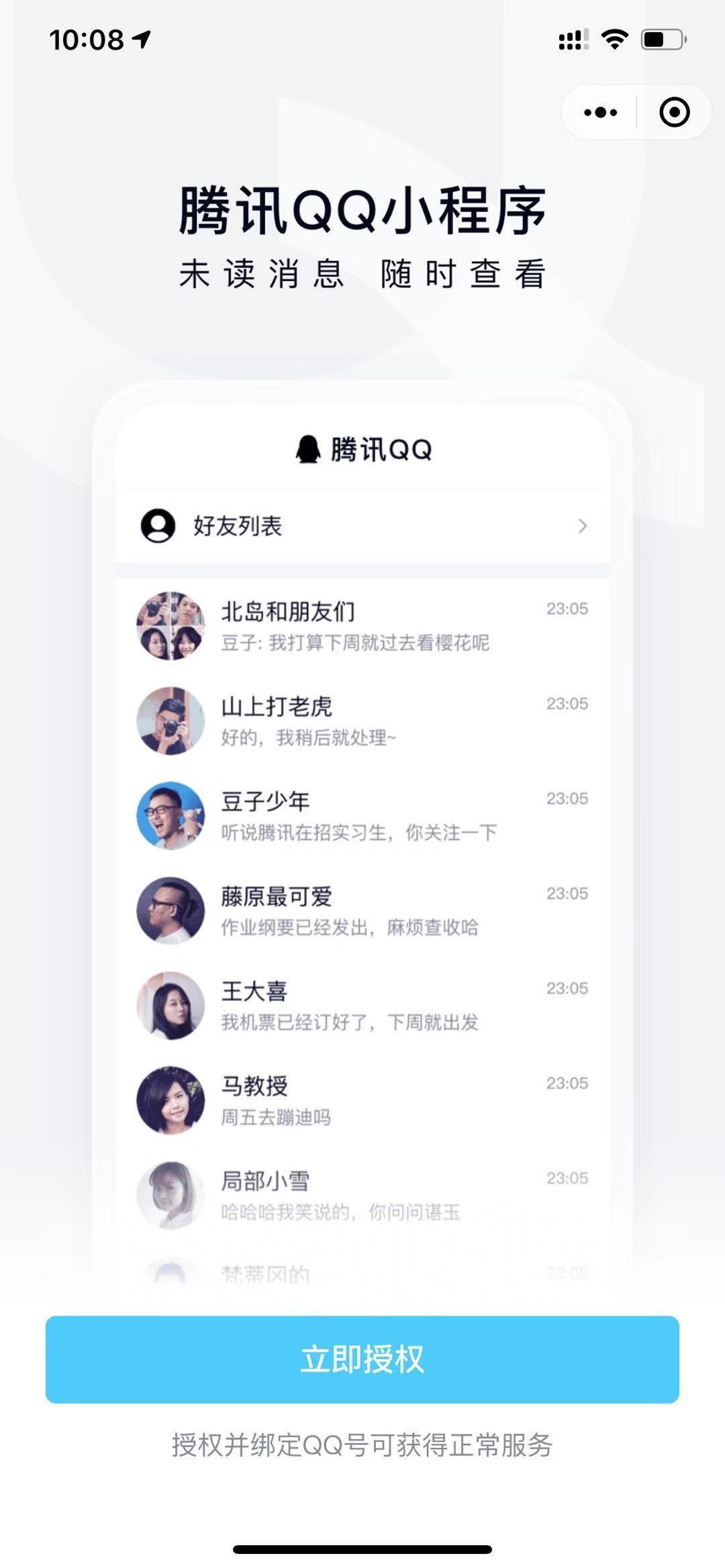 搜索进入「腾讯 QQ」微信小程序,需要授权并绑定 QQ 号才能获得正常服务。