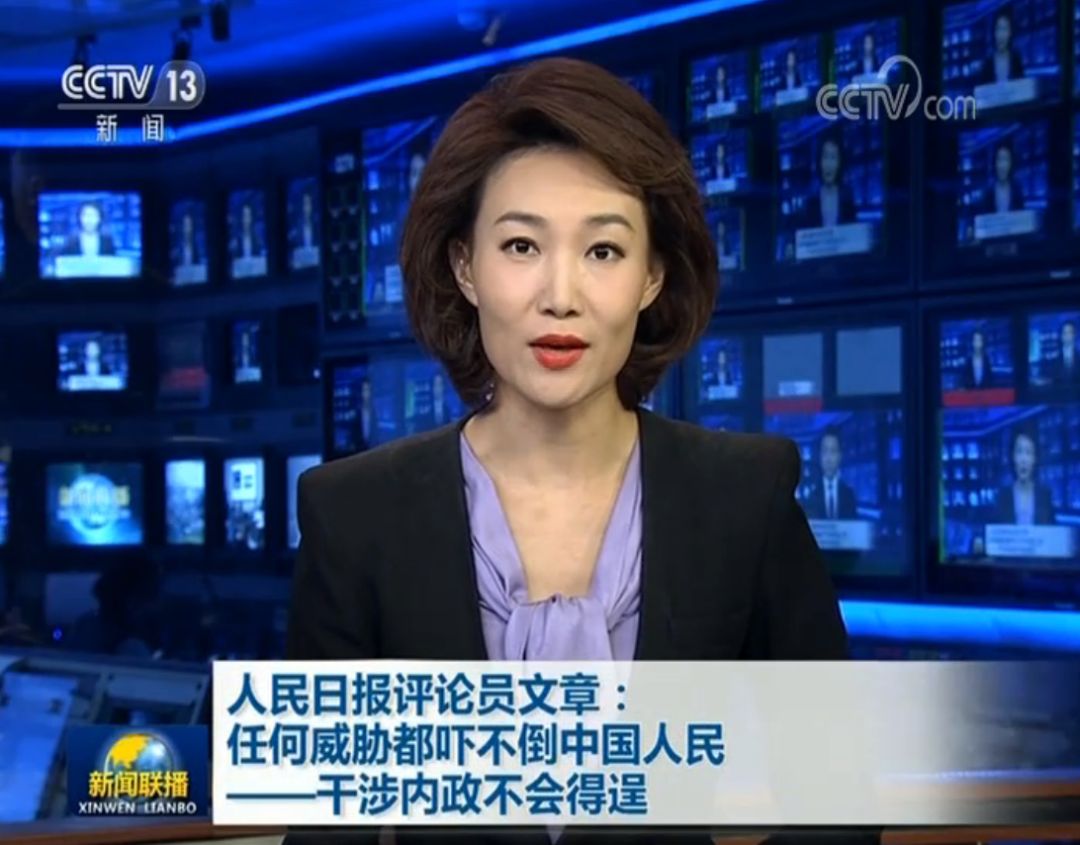 今天出版的人民日报将发表评论员文章《任何威胁都吓不倒中国人民——干涉内政不会得逞》,新华社昨天播发评论员文章《美方一意孤行必将自食恶果》,《新闻联播》刊播国际锐评:涉港“法案”就是个政治闹剧!
