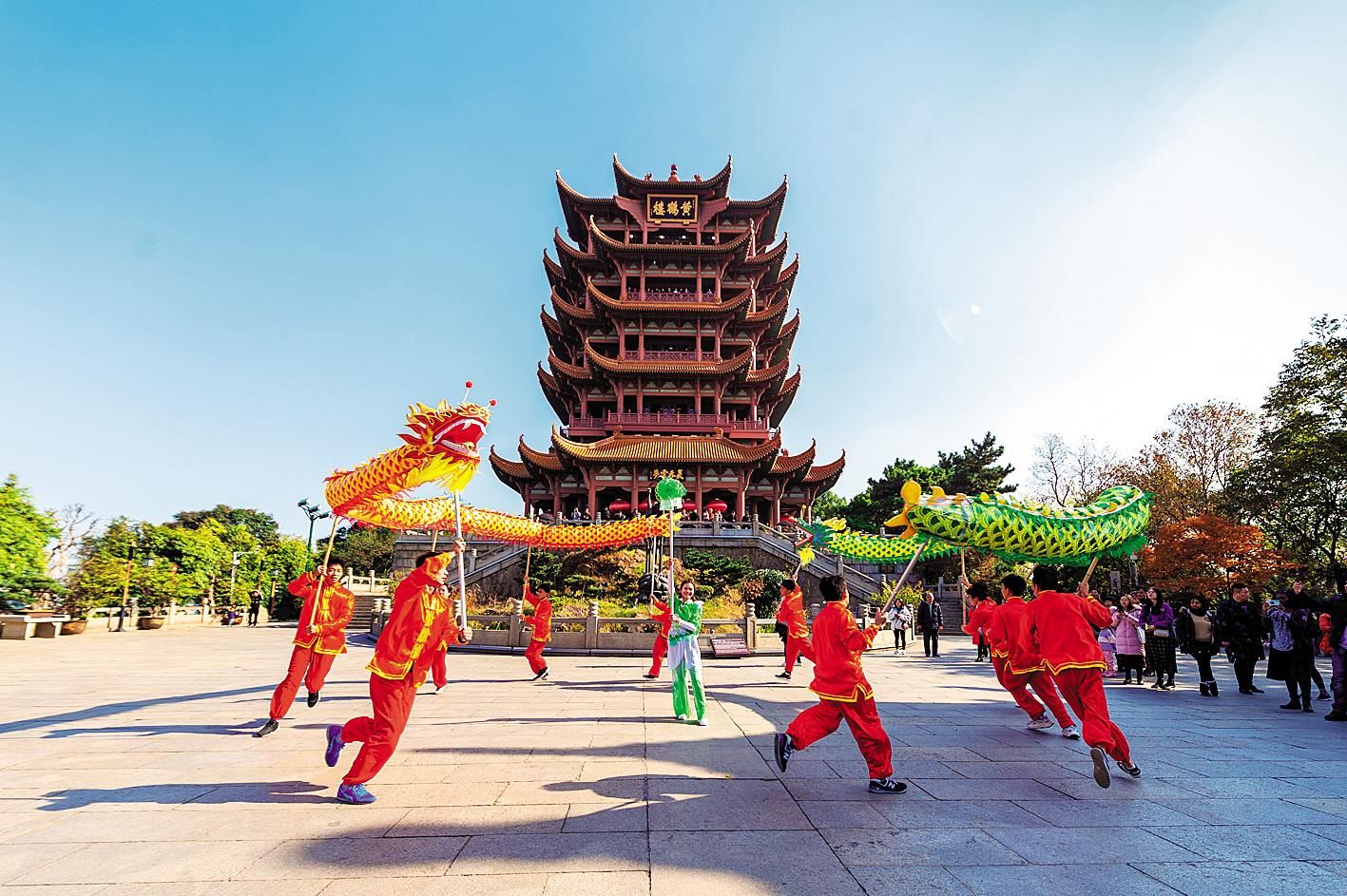 据了解,黄鹤楼国际志愿者由武汉大学、华中师范大学、中国地质大学(武汉)等高校的来自不同国家的留学生组成。图为中国地质大学留学生志愿者在黄鹤楼前为游客表演舞龙。