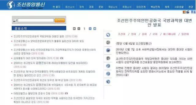 据朝中社12月8日报道,朝鲜国防科学院发言人表示,2019年12月7日下午,朝鲜在西海卫星发射场进行了一次非常重大的试验。朝鲜国防科学院向朝鲜劳动党中央委员会汇报了试验成功的结果,称此次测试结果具有重大意义,将对朝鲜在不久的将来再次改变其战略地位产生重要影响。