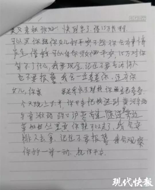 老板你好!快到年了,借15万我用用。可以买你跟你女儿的平安,不然你会有事情发生。借钱可以保你母女俩平安。15万对你算不了什么。我要现金。记住不要告诉他人,也不要报警。我会一直看着你,还有你女儿,你家。要是我收不到钱,你自己看看。今天晚上8点半,你开车把钱送到黄河东路与南湫路路口沪蓉高速隧道旁边草丛里面,你就可以走了。我会安排人去拿。记住不要报警,我会观察你的一举一动。祝你平安。