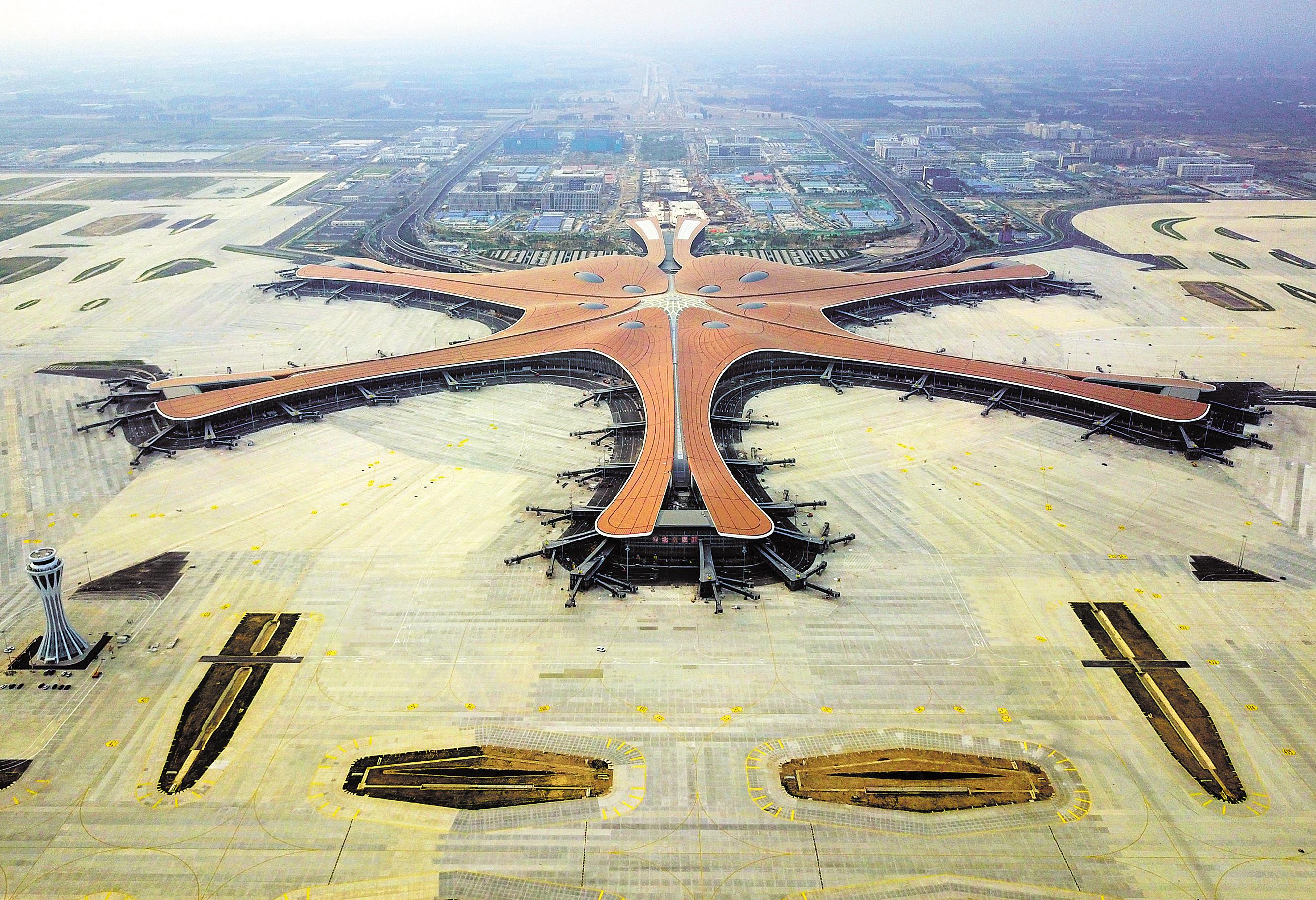 9月25日,外观宛如金色凤凰的大兴国际机场正式投入运营,自2014年12月开工建设至首航投运仅耗时不到5年,被英国《卫报》列为“新世界七大奇迹”之首。图为6月25日拍摄的北京大兴国际机场航站楼。