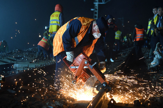 12月24日晚,中铁二十四局工人在拨接现场施工。