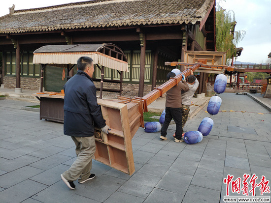 一剧组正在搬动道具。见习记者 魏其濛/摄