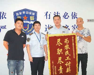 2019年8月,北京市朝阳区劳动保障监察队监察员为10余农民工成功讨薪,农民工代表送锦旗以示感谢。受访者供图