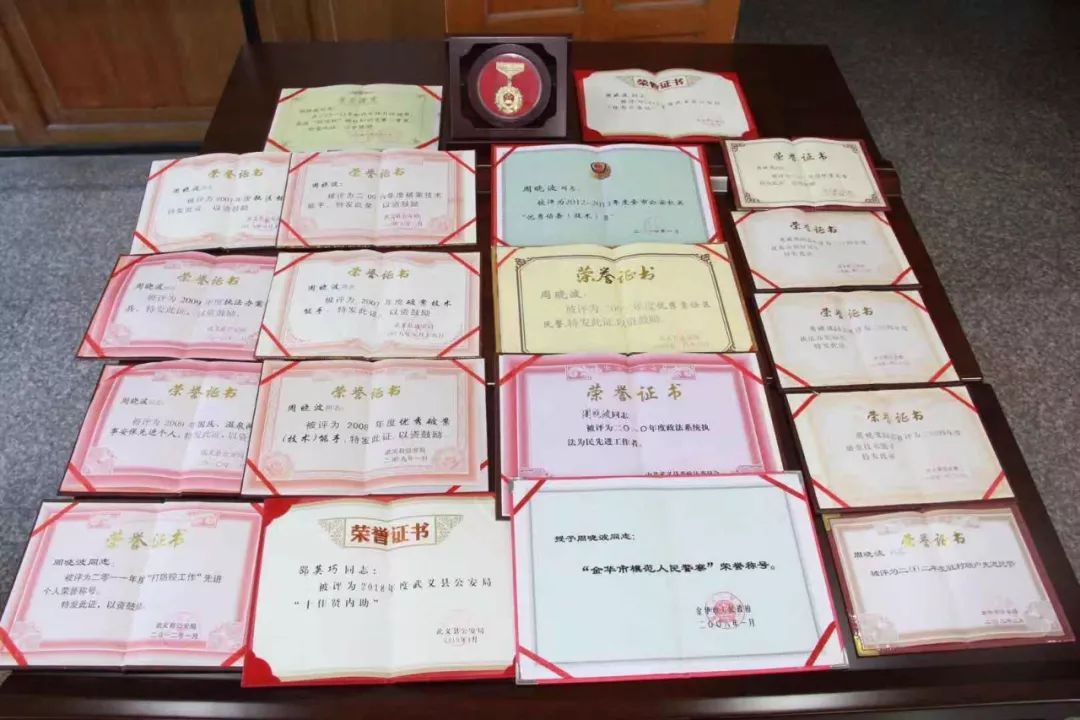 周晓波的家里,有一堆荣誉证书和奖状,他曾被金华市人民政府授予“金华市模范人民警察”,先后荣获金华市公安机关“驻村联户先进民警”“优秀侦查员”,“全县政法系统执法为民先进个人”,连续三年获县局“优秀责任区民警”“破案技术能手”,多次被评为“优秀公务员”“执法办案标兵”。