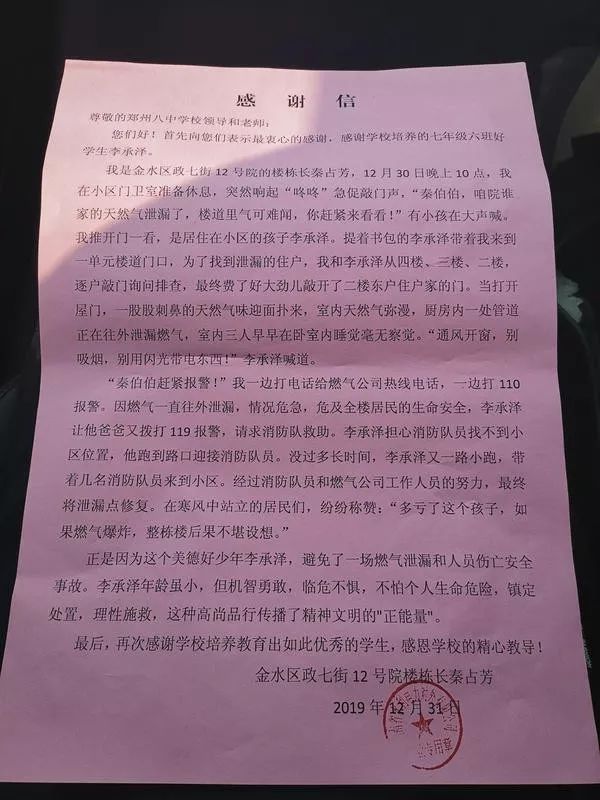 2019年12月31日上午,作为楼栋长,门卫秦师傅代表小区居民来到郑州八中,送去一封感谢信,感谢该校七年级六班学生李承泽及时发现天然气泄漏,并积极帮助疏散邻居,避免了更大事故的发生。