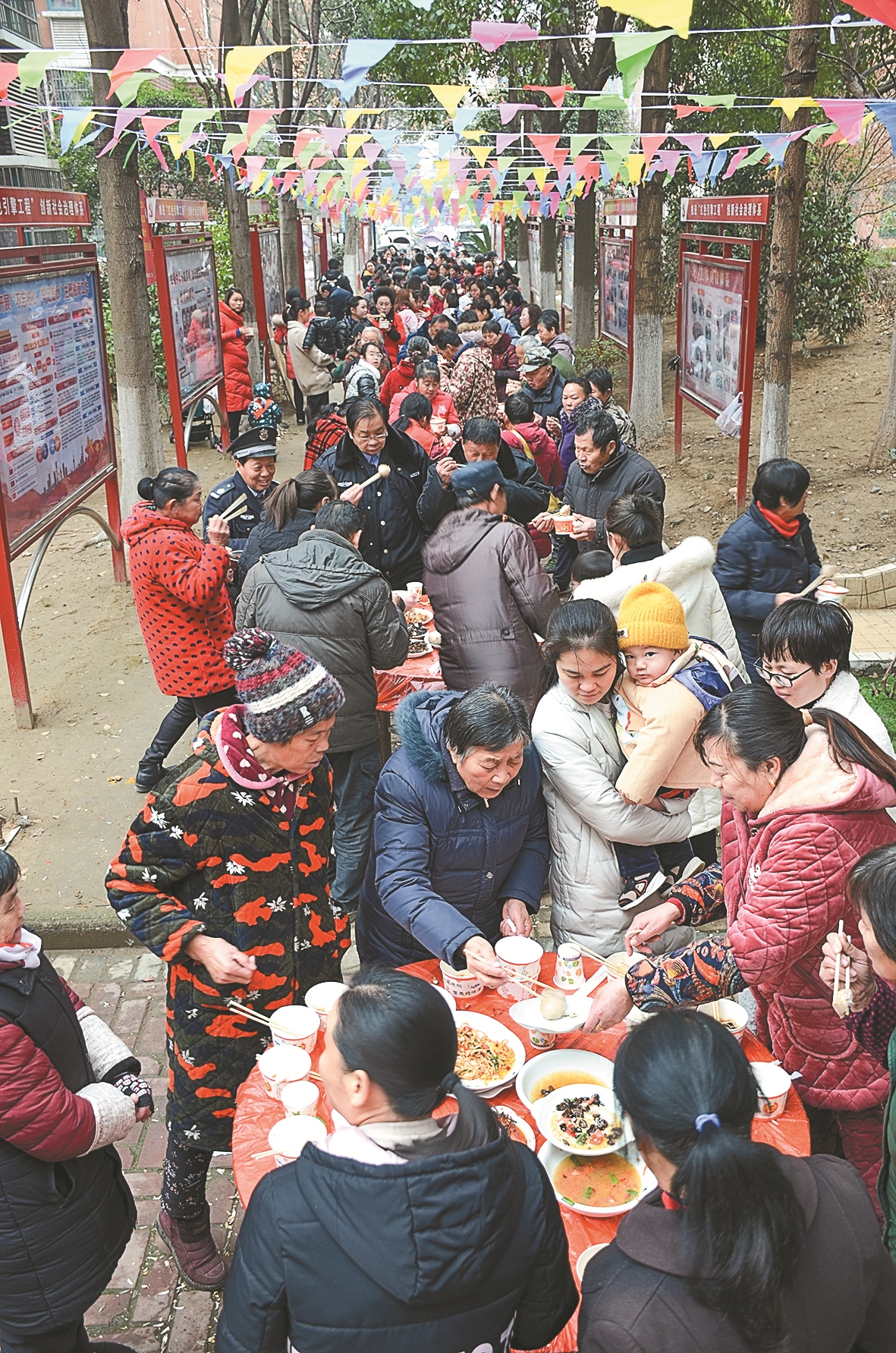 当日上午10时,社区广场搭好舞台,社区艺术团表演《新年好》《我和我的祖国》等舞蹈节目。近800名社区居民聚在一起,一边欣赏节目一边拍短视频发到网上分享。中午,26桌团圆饭摆好,大家共享美食,庆祝新年的到来。