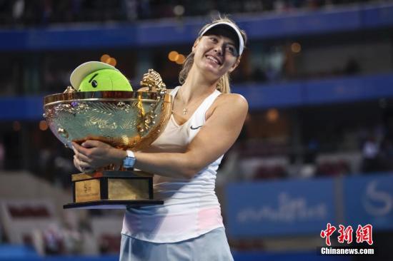 资料图:俄罗斯选手莎拉波娃在颁奖仪式上展示奖杯。当日,在北京国家网球中心举行的2014中国网球公开赛女子单打决赛中,俄罗斯选手莎拉波娃以2比1战胜捷克选手科维托娃,夺得冠军。 中新社发 熊然 摄