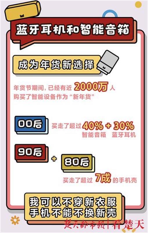 楚天都市报1月8日讯(记者周丹)距离春节还有两周时间,大家纷纷开始抢春运回家的车票、置办回家过年的年货,年货消费正在火速升温。记者发现,今年网购年货出现新的消费趋势:00后热衷于购买智能设备作为“潮流年货”;90后则迎来了“本命年”,“红色”成为年货主题色;80后进入家庭“顶梁柱”角色,“吃”成为80后年货消费的关键词。