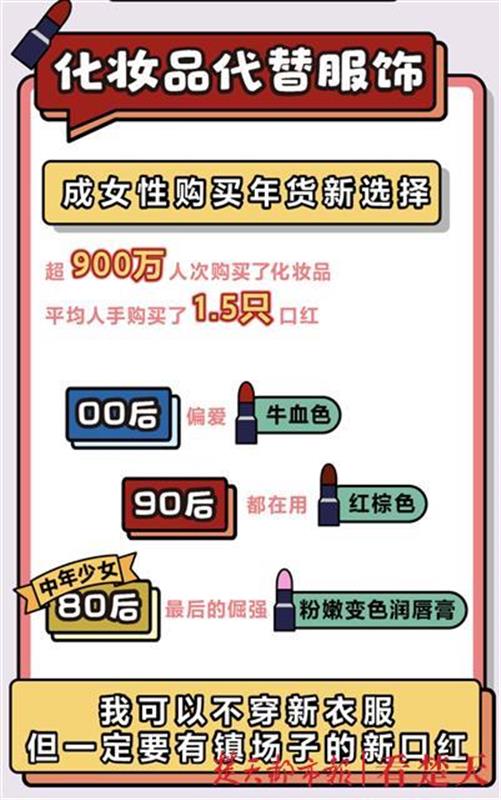 彩妆也取代了新衣服,成为00后最重要的年货之一。00后的新年妆容“可盐可甜”,自带气场的“牛血色”和“人间水蜜桃”成为最热销的口红色号。不过与哥哥姐姐们看网红直播购物不同的是,00后所购买的年货商品中,网红推荐只占了一小部分,他们更享受挖掘小众商品的过程,也对自己的选择更加自信。