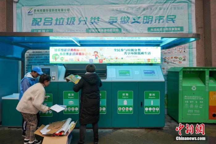 资料图:两位贵阳市民在工作人员的帮助下进行垃圾分类投放。中新社记者 贺俊怡 摄
