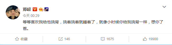 邓超在微博中写道:“等等喜欢我给他挠背,挠着挠着就睡着了,就像小时候你给我挠背一样,想你了爸。”搞怪的邓超,一改往日的诙谐幽默,用很平淡的描述感动了很多网友,纷纷留言表示被邓超在大晚上催泪。