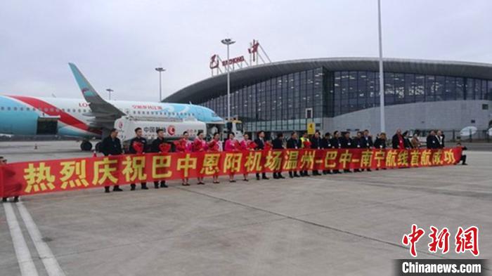 中新网巴中1月10日电 (苗志勇)10日上午,温州经巴中至南宁航线于今年春运首日正式开通,从巴中至南宁仅需2小时左右,巴中到温州仅需2.5小时左右,极大地方便了革命老区巴中人民出行。当地在巴中恩阳机场组织举行了航线开通仪式。该航线开通后,经巴中恩阳机场可直达成都、上海、深圳、银川、北京、昆明、温州、南宁8个城市。