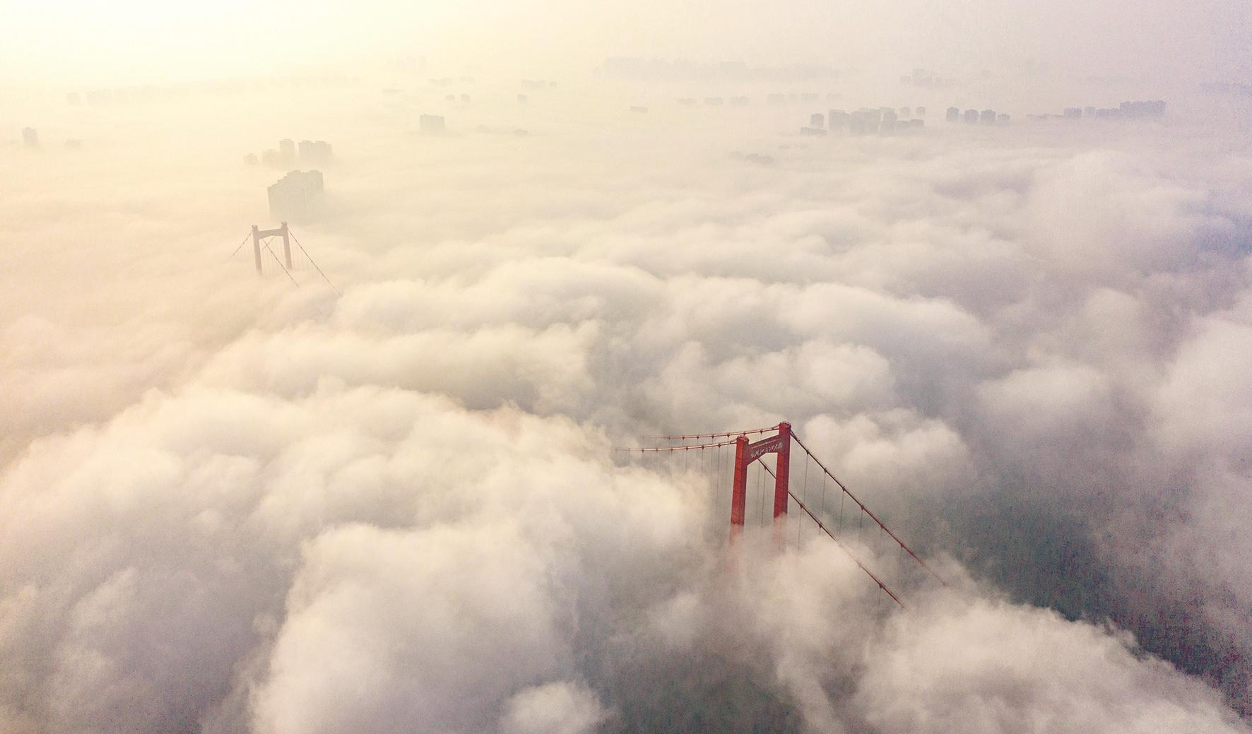 不仅是武汉,全省多地浓雾罩城,十堰、襄阳、随州、仙桃、孝感、武汉、黄冈、鄂州和黄石出现能见度不足200米、局部小于100米的雾。