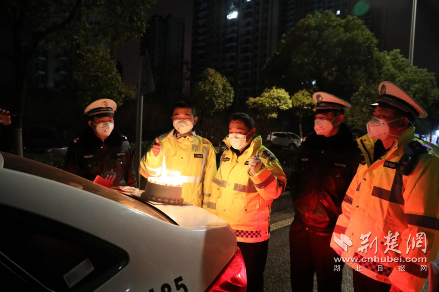2月7日晚6点,快骑队员何永建和王利交班后赶到1号值勤点就餐,警车旁,副局长李小平正等着他们,警车后备箱盖上还放着一个生日蛋糕,原来那天正好是何永建25岁、王利46岁生日。“我知道今天生日,如果是平常,我会和家人聚在一起,但是现在是特殊时期,根本没想过过生日”何永建说。但是点起蜡烛的那一刻,大家都感慨万千,希望这次疫情早点过去,两位寿星吹完蜡烛,大家分享完生日蛋糕后又继续投入了战斗。