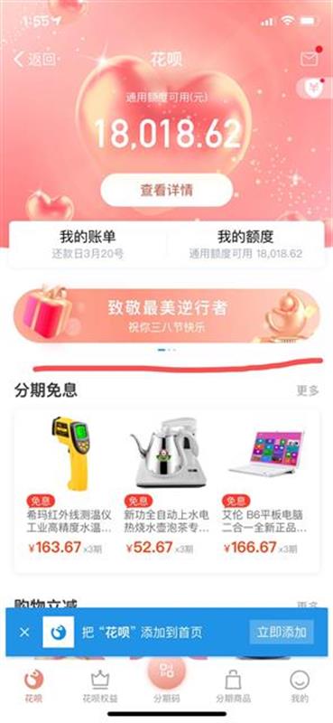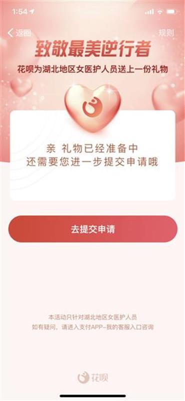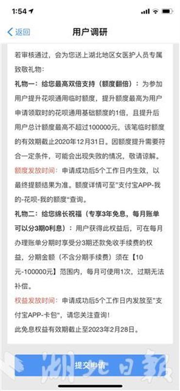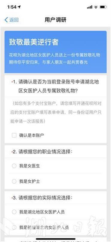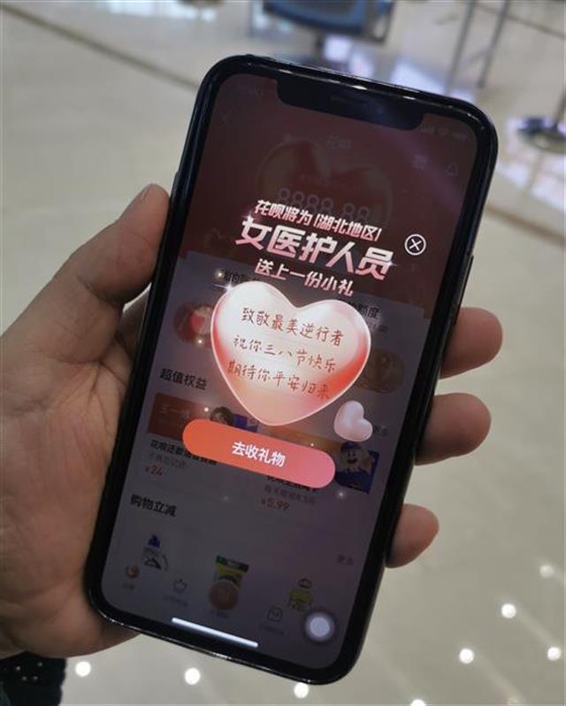 湖北日报讯 (记者黄磊、通讯员李超霖)国际劳动妇女节当日,湖北防疫一线的女医护人员收到了一份特殊礼物:湖北及援鄂女性医护人员支付宝花呗额度最高可以翻倍,三年内每个月花呗账单都可以选择0利息分3期。据不完全统计,目前,湖北省抗疫一线的女性医护人员至少在20万人以上。