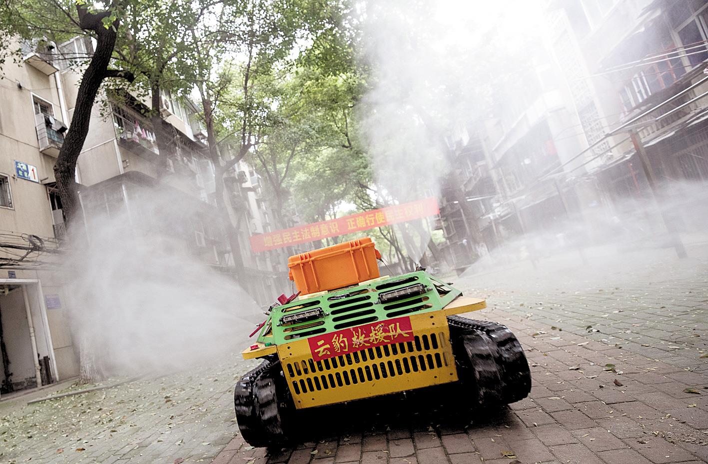 3月16日,武汉市硚口区发展社区,云豹救援队“坦克机器人”正在进行消杀作业。该救援队由武汉市一批热心公益事业的户外爱好者和医护人员组成。疫情发生后,他们自费购买消杀设备、消毒液等物资,走进武汉各社区义务开展消杀工作。