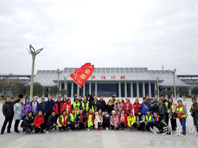 图为:部分网友徒步结束后在丹江口站前合影。通讯员供图