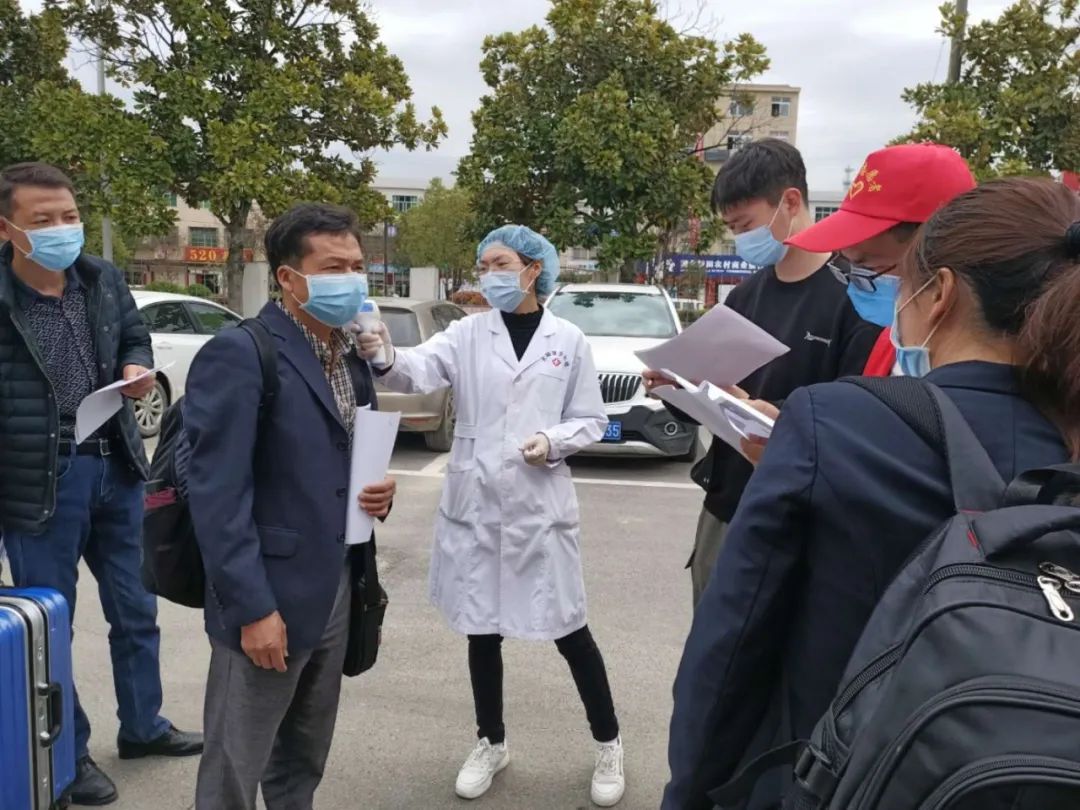 一次体温检测,临行前,组织人员对车辆进行全面消杀,卫生院医护团队负责对每一个上车的人员进行一次体温检测。
