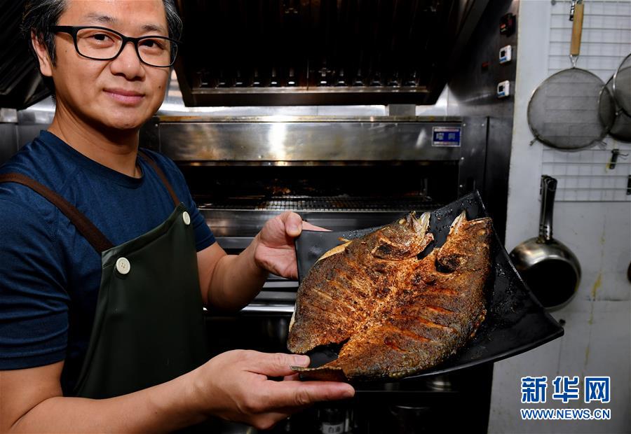 台北市“一品言”餐馆老板兼大厨刘添吉在展示烤鱼(4月24日摄)。 新华社记者 张国俊 摄