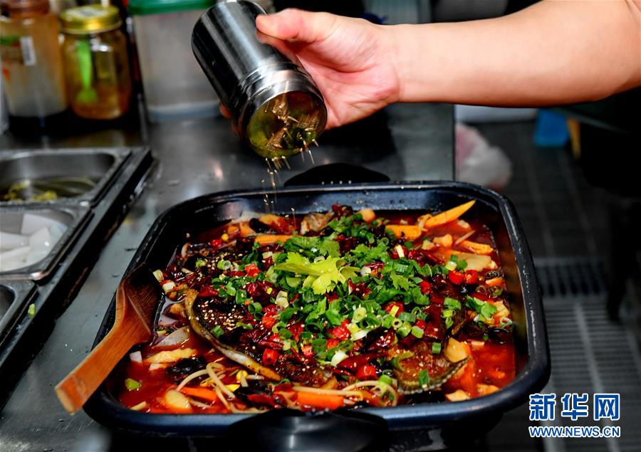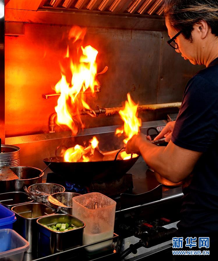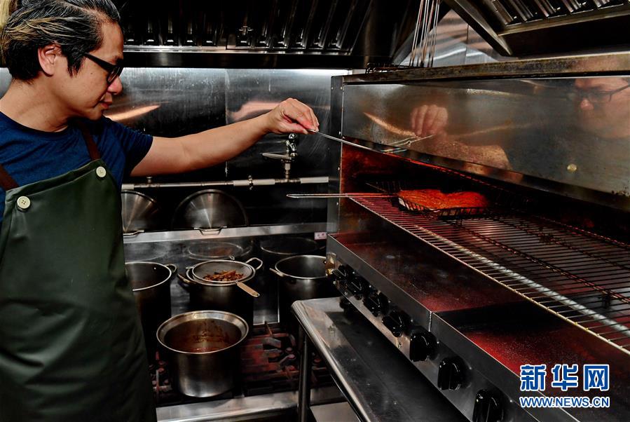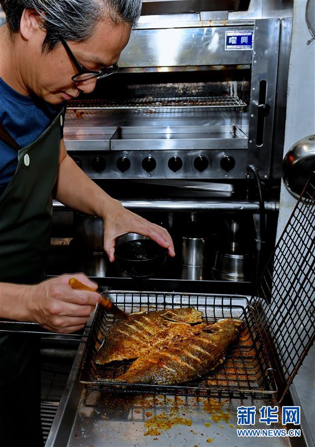 台北市“一品言”餐馆老板兼大厨刘添吉在加工烤鱼(4月24日摄)。 新华社记者 张国俊 摄