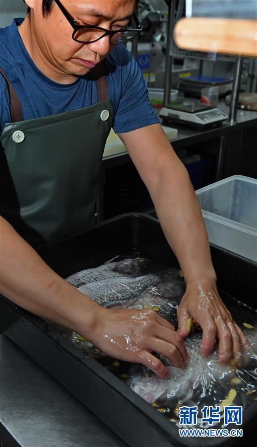 台北市“一品言”餐馆老板兼大厨刘添吉在腌制烤鱼(4月24日摄)。 新华社记者 张国俊 摄
