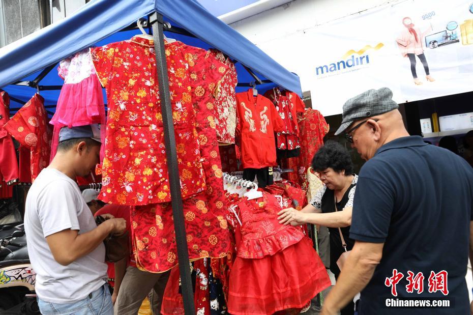 2020年元旦过后,印尼首都雅加达便进入了迎接中国新春佳节的“迎春”季。图为1月6日,顾客在唐人街选购小唐装。中新社记者 林永传 摄
